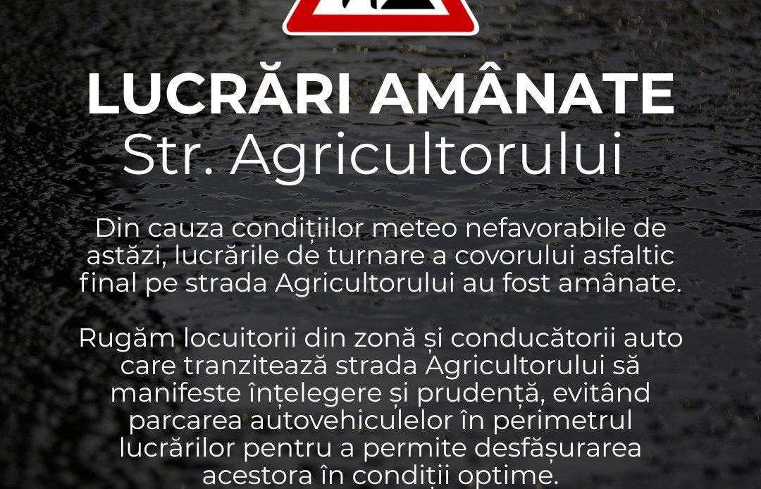 Rugăm locuitorii din zonă și conducătorii auto care tranzitează strada Agricultorului să manifeste înțelegere și prudență, evitând parcarea autovehiculelor în perimetrul lucrărilor pentru a permite desfășurarea acestora în condiții optime.