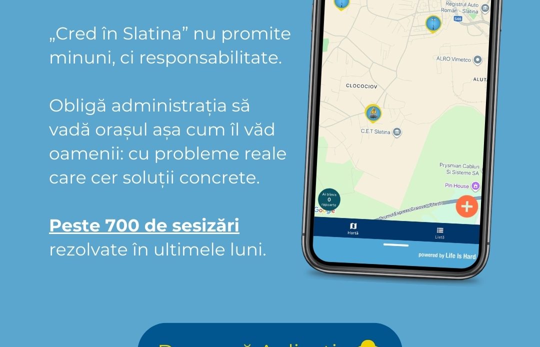 Pe final de an, merită spus un lucru simplu și verificabil: aplicația „Cred în Slatina” și-a dovedit utilitatea. A fost creată pentru a scurta drumul dintre cetățean și administrație, iar rezultatele arată că funcționează.