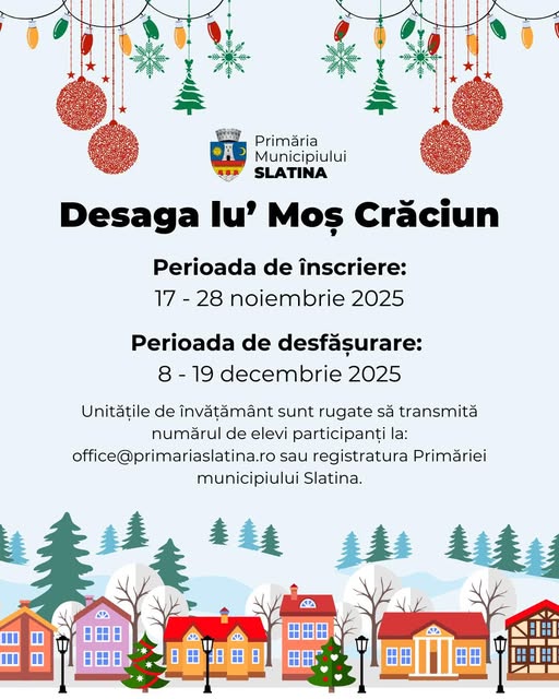 Primăria municipiului Slatina dă startul înscrierilor pentru programul „Desaga lu’ Moș Crăciun”, derulat în preajma sărbătorilor de iarnă, și invită grădinițele și școlile (clasa pregătitoare – clasa a III-a) din oraș să se alăture unui frumos maraton de colinde și momente artistice dedicate Crăciunului.
