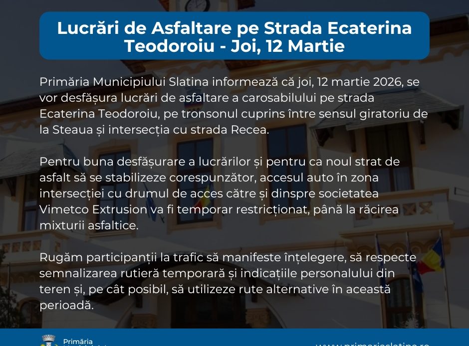 Primăria Municipiului Slatina informează că joi, 12 martie 2026, se vor desfășura lucrări de asfaltare a carosabilului pe strada Ecaterina Teodoroiu, pe tronsonul cuprins între sensul giratoriu de la Steaua și intersecția cu strada Recea.