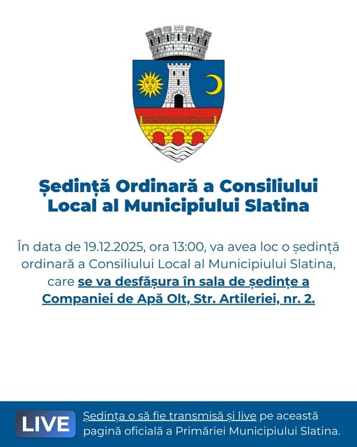 Ședința o să fie transmisă și live pe această pagină oficială a Primăriei Municipiului Slatina.