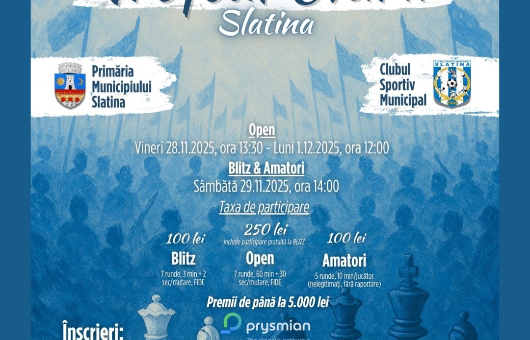 Maeștri internaționali, jucători profesioniști și tineri pasionați se întâlnesc la Festivalul Internațional de Șah – Trofeul Unirii, Ediția a II-a, competiție omologată FIDE, organizată în parteneriat cu Primăria Municipiului Slatina, CSM Slatina și Asociația Club de Șah Gen Olt Slatina.