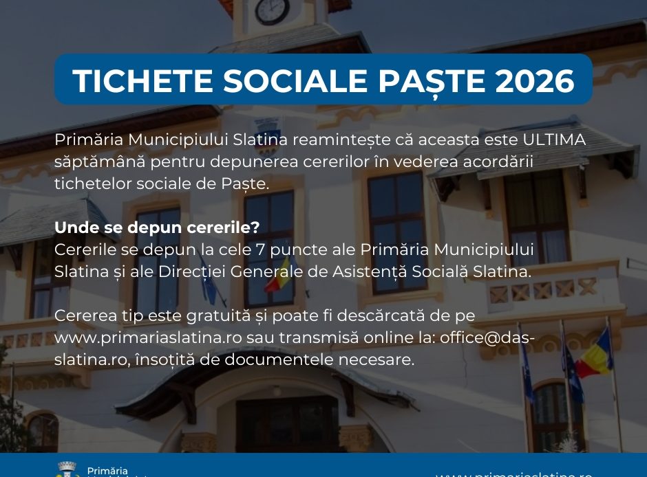 Primăria Municipiului Slatina reamintește că 23 – 27 februarie 2026 este ULTIMA săptămână pentru depunerea cererilor în vederea acordării tichetelor sociale de Paște.